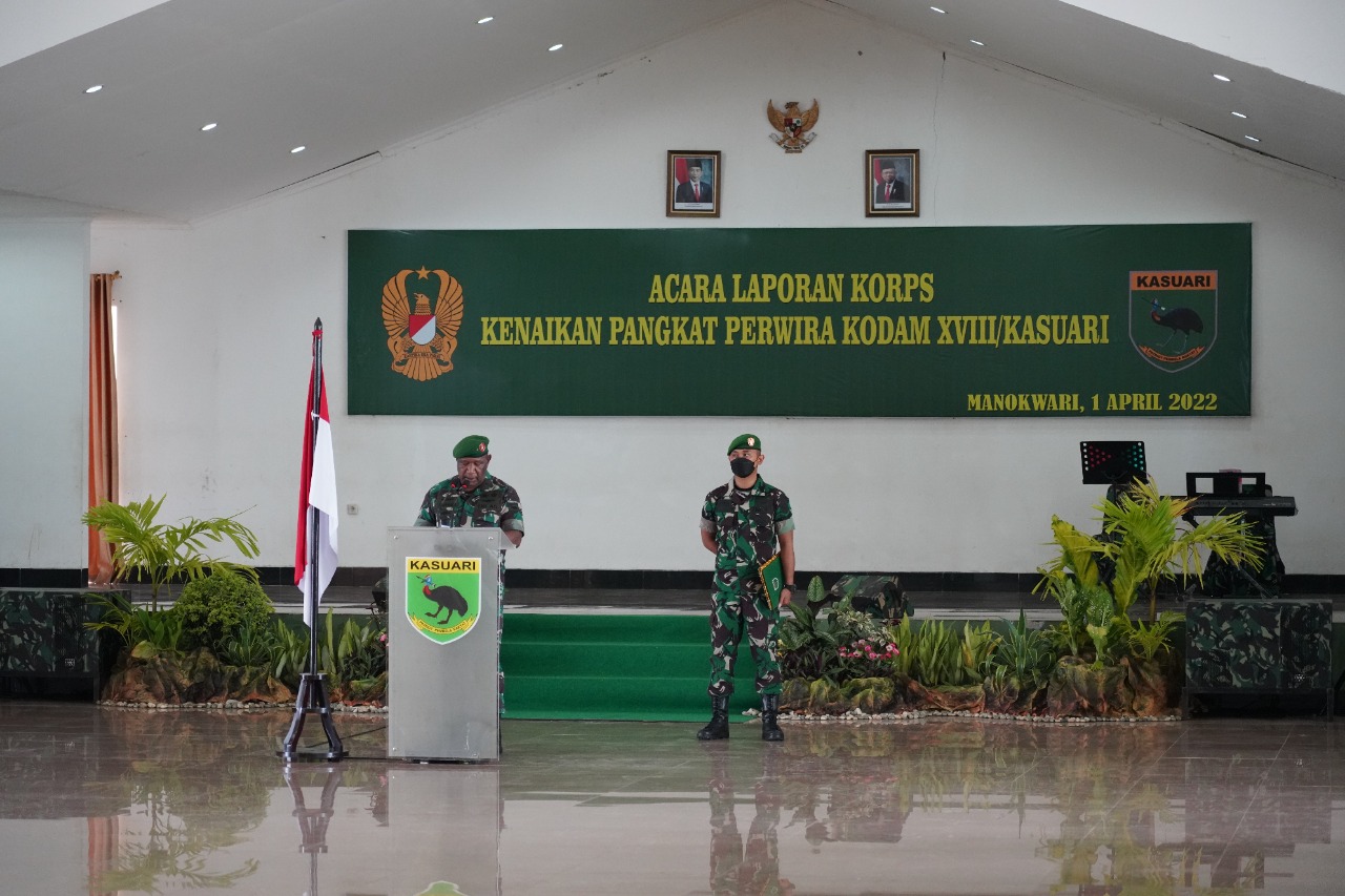 Manokwari. kodam18kasuari.tni-ad.mil.id – Kasdam XVIII/Kasuari, Brigjen TNI Yusuf Ragainaga memimpin secara langsung acara laporan Korps kenaikan pangkat 579 personel Kodam XVIII/Kasuari, di aula Makodam, Trikora, Arfai 1, Manokwari, Papua Barat, Jumat (1/4/2022).