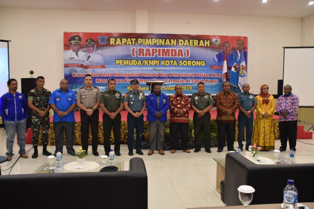 Sorong – Walikota Sorong Drs Ec Lamberthus Jitmau,MM., memimpin pelaksanaan Rapat Pimpinan Daerah dihadiri oleh Ketua KNPI Prov. Papua Barat Sius Dowansiba, SE., Ketua DPD KNPI Kota Sorong Thomas Jitmau, S. Kom., Kadispora Kota Sorong Bpk. Fanik Tahupeiory, S.Sos, MH., Ketua Panitia RAPIMDA KNPI Robianus Kambu, SE., Paban Dalpers Lantamal XIV Letkol Laut (KH) A.H Sabale SH., Danramil Sortim Mayor Inf H. Triyana,S.P.DI, M.PDI., Danyon Yonmarhanlan XIV Mayor Mar M. Ali Wardana, Pasi Ter Korem 181/ PVT Kapten Inf Muklison Effendi, SH., Kapolsek Sorong Timur AKP Junaidy A. Weken S. Ik., Danton 1 Ki B Yonif RK 762/VYS Lettu Inf Tubagus. Boy, Ka bidang Kewaspadaan Nasional Kesbangpol Kota Sorong Hartoyo S.Sos .MM., Ketua Bawaslu Kota Sorong Elias Idjie.ST., Ketua DPD KNPI Maybrat Terry Isir,ST., Ketua DPD KNPI Kab. Sorong Karlos Kalasuwat, Kader HMI MPO, Kader GMKI, Kader GMNI, Kader Himamsi, Forum komunikasi Putra-putri purnawirawan dan Putra-putri TNI Polri (FKPPI) bertempat di Hotel Vega, Sorong-Papua Barat, Jumat (19/01/2019).