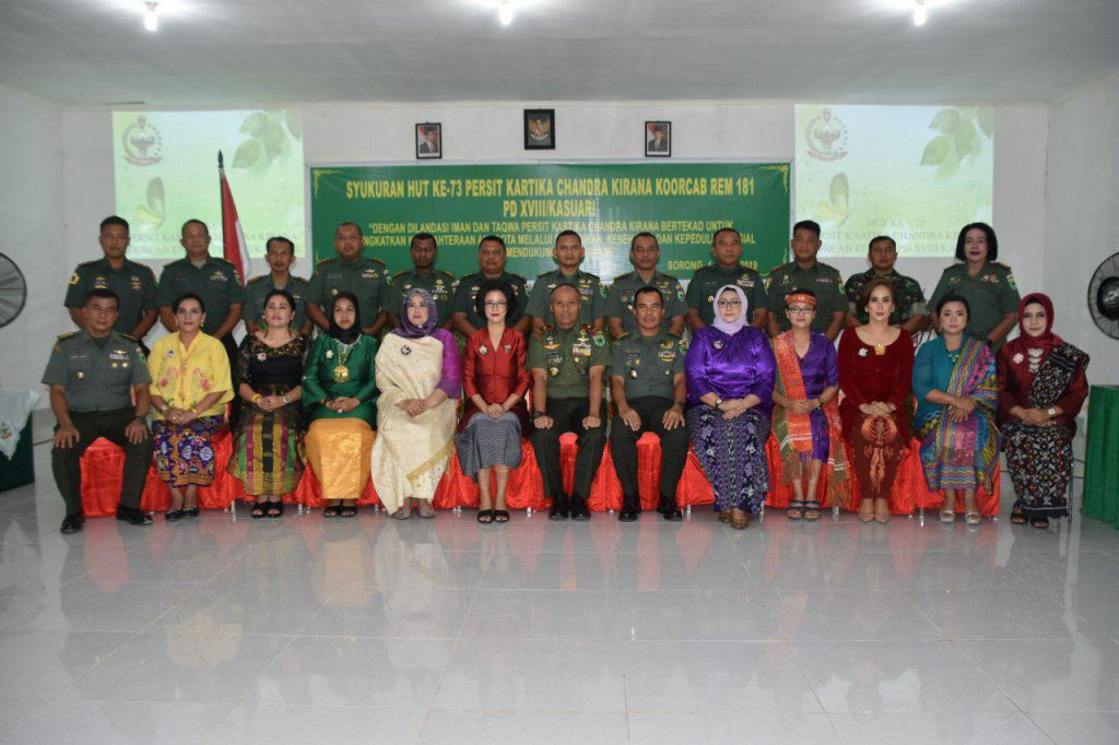 Kegiatan syukuran HUT ke-73 Persit KCK tahun 2019 dilaksanakan pada Kamis, 4 April 2019 di Aula Korem 181/PVT, Jalan Pramuka No. 1, Sorong, Papua Barat. Dihadiri oleh Ketua Persit KCK Koorcabrem 181, Ny. Natalia Ignatius Yogo Triyono, para pengurus, para Ketua-Ketua Cabang dan Anak Ranting. Danrem 181/PVT Brigjen TNI Ignatius Yogo Triyono, M.A selaku Pembina Persit KCK Koorcabrem 181 PD XVIII/Kasuari ikut hadir bersama Kasrem, para Kasi Korem 181/PVT, para Komandan Satuan dan Ka Balak Aju jajaran Korem 181/PVT.