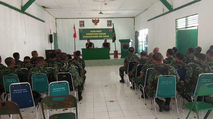 Fakfak – lapangan Apel Makodim 1706/Fakfak Pabandya Ren Ops Kodam XVIII/Ksr, Letkol Inf Dwi Mawan Susanto telah memberikan pengarahan kepada anggota Kodim 1706/Fakfak, mengawasi dan evaluasi latihan minggu militer dengan materi PPM. Waster Kodam XVIII/Kasuari, Letkol Inf Daniel E. S. Lalawi dan Pabanda Puanter Kodam XVIII/Ksr, Kapten Kav Wahyu Fredy Susanto, Bertempat di aula Kodim 1706/Fakfak melaksanakan acara Wasev steradam XVIII/Kasuari di wilayah Kodim 1706/Fakfak yang di ikuti sekitar kurang lebih 25 orang anggota Babinsa jajaran Kodim 1706/Fakfak, Hadir dalam acara tersebut yaitu,Kapten Inf Siswanto ( Pasiter Dim 1706/Fakfak ), Kapten Inf Bonadji ( Pasi Ops Dim 1706/Fakfak ), Kapten Inf Ali Anwar ( Danramil Kokas Dim 1706/Fakfak), Letda Inf Adam Fuad ( Pa Sandi Dim 1706/Fakfak ), Para Babinsa jajaran Kodim 1706/Fakfak, Selasa (27/11/2018).