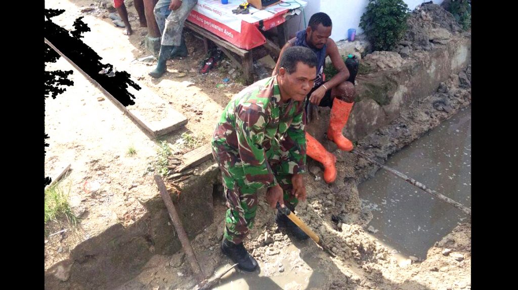 Kaimana – Babinsa Koramil 1713-02/Teluk Etna, Serda Izak M bantu masyarakat dalam pembuatan saluran Air, di Kampung Kiruru, Distrik Teluk Etna, Kab Kaimana, Kamis (14/12/2017).