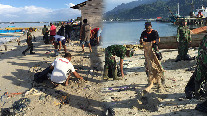 Kaimana – Bertempat di Kampung Seram, Kab. Kaimana Papua Barat anggota kodim 1713/kaimana melaksanakan pembersihan sekitar pantai dan pelabuhan lokal kampung seram, yang dipimpin langsung oleh pasi ops kodim 1713/kaimana kapten inf Yosias Waimbo, Senin (02/04/18).