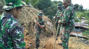 Sorong – Dalam rangka mengatasi kesulitan Rakyat, anggota Koramil 1704-02/Sorong Barat dipimpin oleh Bati Tuud Serma Sariyanto melaksanakan gotong royong membantu perbaiki rumah Tokoh Masyarakat korban tanah longsor Bapak Daniel bertempat di Kelurahan Puncak Cenderawasih, Kota Sorong, Selasa (12/06/2018).