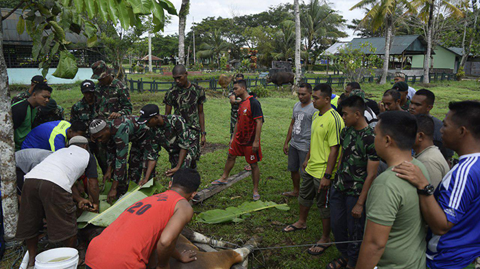 Sorong, Anggota Yonif Raider Khusus 752/VYS melaksanakan pemotongan hewan kurban, yakni tiga ekor sapi,Rabu (22/08/18).