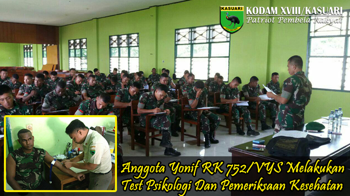 Untuk pelaksanaannya untuk Kompi Senapan D Manokwari, 50 orang laksanakan Rikes dan Keswa di Rumkitban Manokwari, dan 50 orang laksanakan Tes Psikologi di Kampus STKIP Muhamadiyah Manokwari, sedangkan untuk Kompi Bantuan Sorong 88 orang laksanakan Rikes di Denkesyah Korem 171/PVT dan dilanjutkan Keswa bertempat di SMP Muria, dan 87 orang laksanakan Tes Psikologi di Aula Jenderal Sudirman Yonif RK 752/VYS.