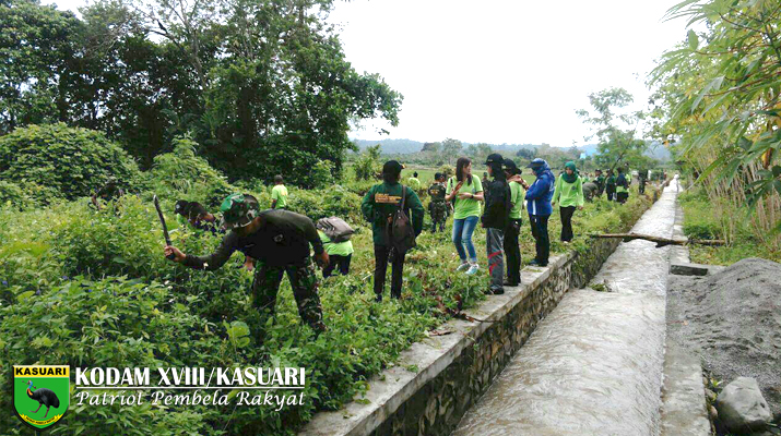 Manokwari – Danramil 1703-04/Warmare Lettu Inf Sudiyantoro dan Babinsa Koramil 1703-04/Warmare sebanyak 5 orang bersama Mahasiswa/i STKIP Muhammadiyah Manokwari melaksanakan kegiatan pembersihan saluran irigasi di Kampung Prafi Mulya Distrik Prafi Kabupaten Manokwari Provinsi Papua Barat, Kamis (09/03/2017).