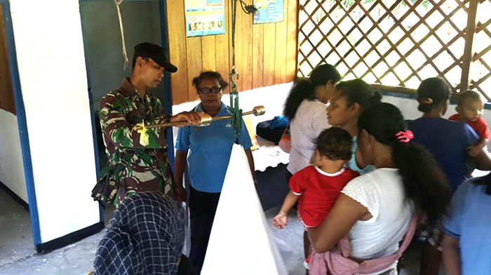 Serda Susanto Babinsa Koramil 1704-02/Sausapor bersama petugas medis Posyandu melaksanakan kegiatan penimbangan bayi sehat dan pemberian tambahan gizi kepada ibu dan balita yang bertempat Posyandu Kampung Sau Oryan Distrik Sausapor.