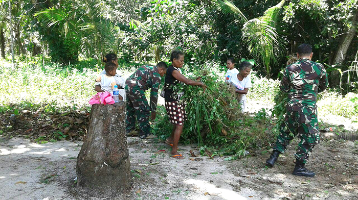 Dalam pelaksanaannya para Babinsa bersama warga membaur bersama melakukan pembersihan sampah-sampah dari kayu, plastik dan pecahan pecahan botol kaleng bekas minuman serta benda material glondongan, semua material sampah itu dengan mudah ditemukan karena berserakan di sepanjang pantai, setelah semua dikumpulkan, tumpukan sampah itu langsung dibakar dan sebagian ditimbun.