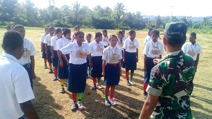 Sorong – Bintara Pembina Desa (Babinsa) Koramil 1704-09/Kabare Serma Saryo memberikan pelajaran Peraturan Baris-Berbaris (PBB) kepada calon Siswa-siswi SMA 5 Kabare, Rabu (26/07/2017).
