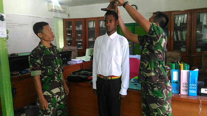 Bertempat di Balai Distrik Inanwatan Kab. Sorong Selatan Babinsa melaksanakan Cek Akhir tinggi badan untuk kesiapan pendaftaran Calon Bintara Karier yang selanjutnya akan diantar/didampingi ke Ajen Korem 171/PVT. Disamping kegiatan tersebut Babinsa juga memberikan arahan/penjelasan kepada pemuda Kampung binaan tentang tahap-tahap dalam seleksi penerimaan anggota TNI TA 2017.