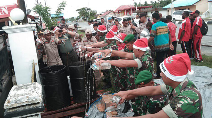 Sorong – Menjelang Natal dan Tahun Baru 2019 Bertempat di lapangan apel Polres Sorong Selatan jalan brawijaya no 1 Teminabuan Kabupaten Sorong Selatan dilaksanakan apel gabungan bersama 1 SSR TNI AD(Koramil 1802-08 Teminabuan), 1 SSK POLRI (Polres Sorong Selatan), 1 SSR Sat PolAirud Polres Sorong Selatan dan 1 SSR BNPB Pemda Sorong Selatan dan setela apel gelar pasukan selesai di lanjutkan dengan pemusnahan MIRAS hasil Ops K2YD Polres Sorong Selatan dan koramil 1802-08/teminabuan. dan. dalam rangka OPERASI LILIN MANSINAM 2018 Dalam Rangka PENGAMANAN NATAL DAN TAHUN BARU 2019, Jumat (21/12/2018).