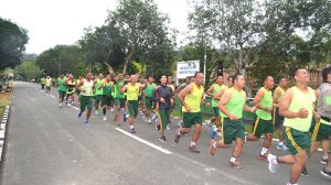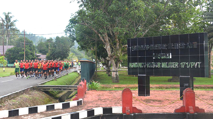 Sorong – Apel gabungan Prajurit dan PNS Korem 171/PVT bersama Balak Aju jajaran Korem 171/PVT dalam rangka melaksanakan Lari Aerobik yang dipimpin oleh anggota Jasrem 171/PVT dengan materi lari ketahanan selama 30 menit dengan mengambil route lintasan lari Makorem 171/PVT Jl. Pramuka No. 1 Sorong Papua-Barat, Selasa (24/07/2018).