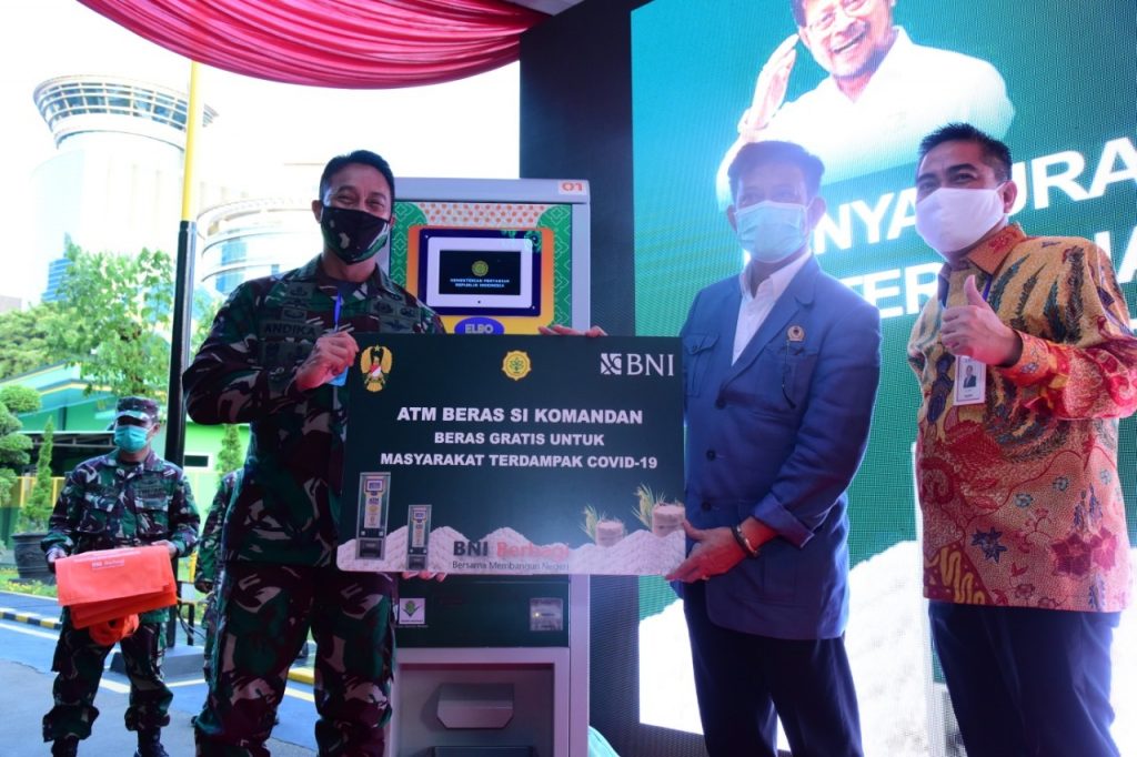 Kasad Jenderal TNI Andika Perkasa dan Mentan Syahril Yasin Limpo beserta Senior Vice President BNI Koen Yulianto menginisiasi adanya dukungan beras gratis bagi warga miskin yang terdampak corona dalam bentuk ATM Pertanian Si Komandan.