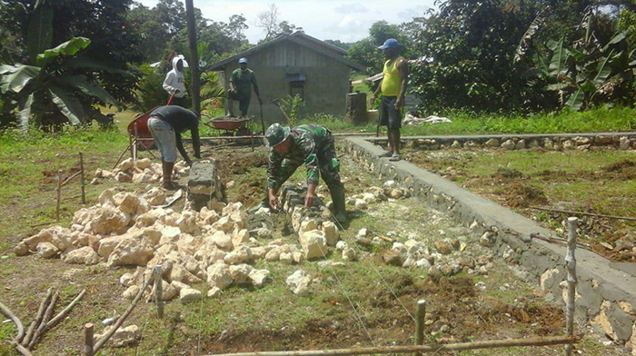 Sorong – Babinsa Kampung Aisa, Distrik Aifat Timur Koramil 1704-11/Aifat Serda Rosyadi bersama warga masyarakat kampung binaan sebanyak 25 orang secara gotong royong melaksanakan kegiatan karya bakti pembuatan pondasi rumah milik Bapak Iknatius (53) di Kampung Aisa, Distrik Aifat Timur kabupaten Maybrat, Rabu (05/12/2018).