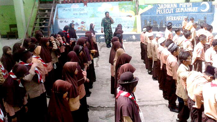 Fakfak – Babinsa Koramil 1706-01/Kota, Serka Erpan Nusantoro bersama Babinsa Kopda Nur Said memberikan Wawasan Kebangsaan (Wasbang) tentang Bhineka Tunggal Ika, Pancasila dan PBB kepada siswa siswi Sekolah Madrasah Ibtidaiyah di Distrik Pariwari Kab. Fakfak, Senin (27/08/18).
