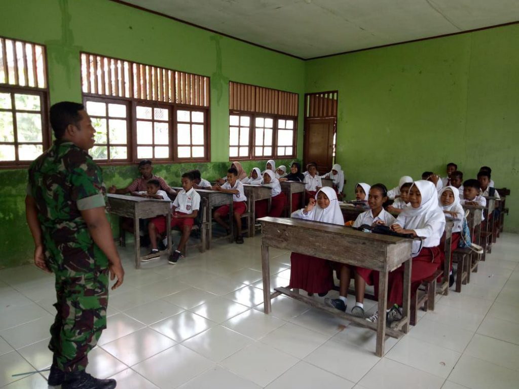 Raja Ampat – Babinsa Koramil 04/Misool Kodim 1805/Raja Ampat Serda Ikhwansyah memberikan materi wawasan kebangsaan kepada siswa-siswi SD Negeri 17 Raja Ampat yang terletak di kampung Yellu, Distrik Misool Selatan, Kab. Raja Ampat, Rabu (13/2/2019).