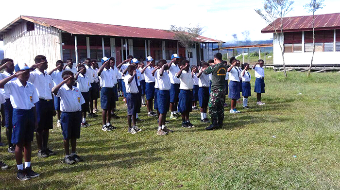 Manokwari – Dalam rangka membentuk generasi muda yang handal dan generasi muda yang maju serta mewujudkan kerjasama antara TNI dengan pemerintah dalam rangka menyiapkan generasi muda yang berkualitas dan berdisiplin tinggi serta berjiwa nasionalisme tinggi, Babinsa Koramil 1703-09/Anggi Sertu Edy Yasmanto dan Kopda Yasin, melaksanakan kegiatan pemberian materi Wawasan Kebangsaan yang bertempat di SMP Negeri 1 Anggi, Distrik Anggi, Kab. Pegunungan Arfak, Prov. Papua Barat, Senin (27/11/2017).