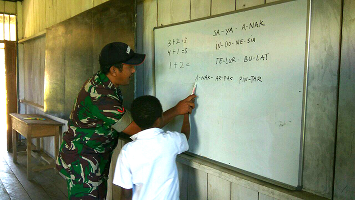 “Ini bentuk nyata yang dilakukan TNI AD menerapkan OMSP. Bentuk kerjasama antara Kementerian Pendidikan dan Kebudayaan dengan Mabes TNI dalam meningkatkan pendidikan di daerah terpencil, di perbatasan, maupun di pedalaman, sebagai guru bantu di sekolah yang masih kesulitan mendapat tenaga pendidik, “ujar Danramil.