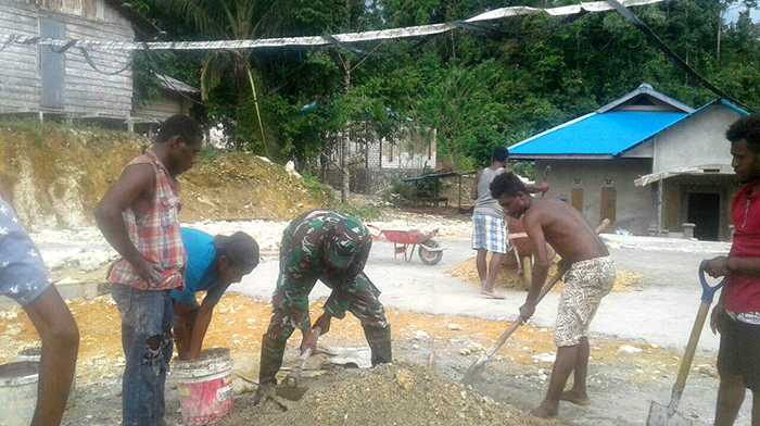 Sorong – Babinsa kampung Kambufatem Kopda Januarius bersama sama dengan warga dan Karang Taruna kampung Hosio Distrik Aitinyo Barat melaksanakan Karya Bhakti pembuatan Lapangan Volly Ball, Kamis (23/11/17).