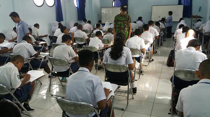 Sorong – Babinsa Koramil 1704-13/Sorong, Barat Serda Adil melaksanakan sosialisasi dan pengawasan ujian kepada calon siswa baru SUPM Negeri Sorong di kampus SUPM Negeri Sorong, Jl. A. Yani Kel. Klakublik, Distrik Sorong Kota, Senin (03/07/2017).