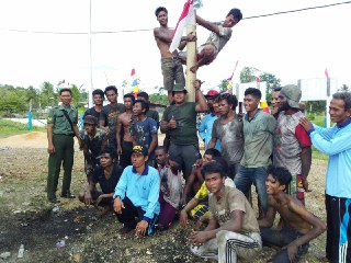 Sorong – Dalam rangka memeriahkan HUT RI ke 73, Babinsa Kampung Wariyau Koramil 1704-06/Beraur Serka Artono bersama Kepala Kampung Wariyau Bapak Agus Setiawan para Bamuskam, tokoh agama, tokoh adat, tokoh pemuda, tokoh perempuan serta warga masyarakat beramai-ramai melaksanakan berbagai macam perlombaan seperti, Lomba Panjat Pinang, Bola Volly Putra, Tarik Tambang, Tari Tobelo, Lomba Balap Karung dan Lomba bawa kelereng ditaruh diatas sendok, Senin (20/08/2018).