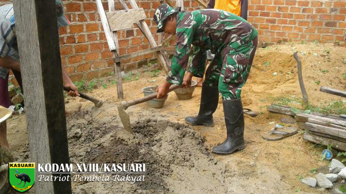 Sorong – Koptu Pamujiono Babinsa Koramil 1704-14/Beraur jajaran Kodim 1704/Sorong bersama Masyarakat membangun kantor Kampung Tanah Tinggi Distrik malabotom Kabupaten Sorong Papua Barat, Senin (17/04/17).