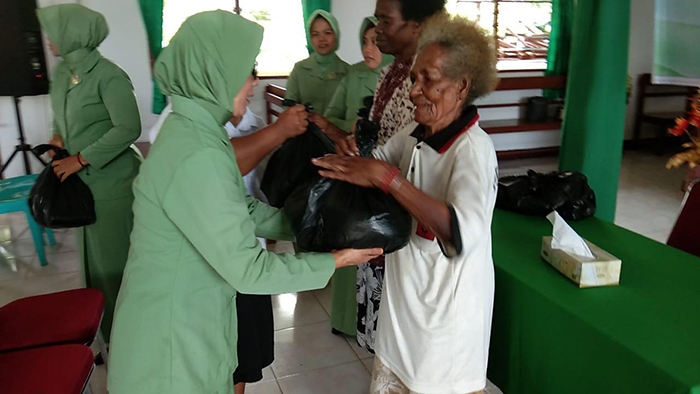 Babinsa Koramil 1704-08/Teminabuan Serma Soleman bersama anggota Persit Ranting 9 Koramil 1704-08/Teminabuan berbagi tali kasih dengan menyerahkan bingkisan sembako kepada warga jamaat di Gereja Teberias Seyolo Teminabuan.