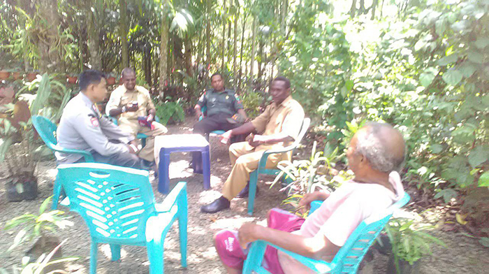 Sorong – Guna meningkatkan hubungan kerja yang baik di wilayah, Babinsa Kelurahan Kampung Salak Koramil 1704/02 Sorong Barat Kopda Thomas Yembisa bersama Babinkamtibmas melaksanakan Komunikasi Sosial (komsos) bersama Kepala Kelurahan kampung Salak, di rumah Bapak Mambrasar selaku Ketua RT. Komsos tersebut dilakukan untuk menjalin tali silaturahmi dan pembinaan terhadap masyarakat di Kampung binaan, Senin (29/10/2018).