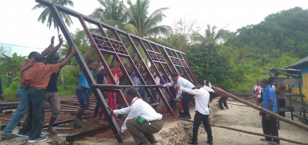 Raja Ampat – Babinsa Koramil 1805-01/Waisai Serda Max Kelen bersama dengan Majelis Jemaat Kampung Paam, dan seluruh masyarakat Kampung Saupapir Bahu-membahu mendirikan tiang Pembangunan Gedung Gereja Emaus Saupapir bertempat di Kampung Saupapir Distrik Waigeo Barat Kepulauan Kabupaten Raja Ampat, Kamis (04/07/2019).