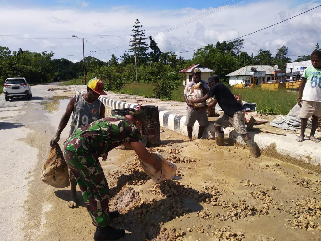 Sorong – Serda Rivo Mokoginta Babinsa Kampung Boldon Koramil 1802-08/Teminabuan, bersama sama masyarakat melaksanakan kegiatan karya bakti perbaikan jalan yang rusak menuju jalan masuk ke perkampungan, di Kampung Boldon Kabupaten Sorong Selatan, Kamis (17/01/2019).
