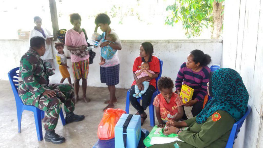 Sorong – Babinsa Kampung Kasimle Koramil 1802-04/Seget Serda Susanto membantu sekaligus melaksanakan pendampingan petugas kesehatan dari Puskesmas Disterik Seget dalam rangka kegiatan rutin bulanan berupa Posyandu dan pengobatan khususnya ibu-ibu hamil dan balita dibalai kampung Kasimle Disterik Seget Kabupaten Sorong, Kamis (28/03/2019).