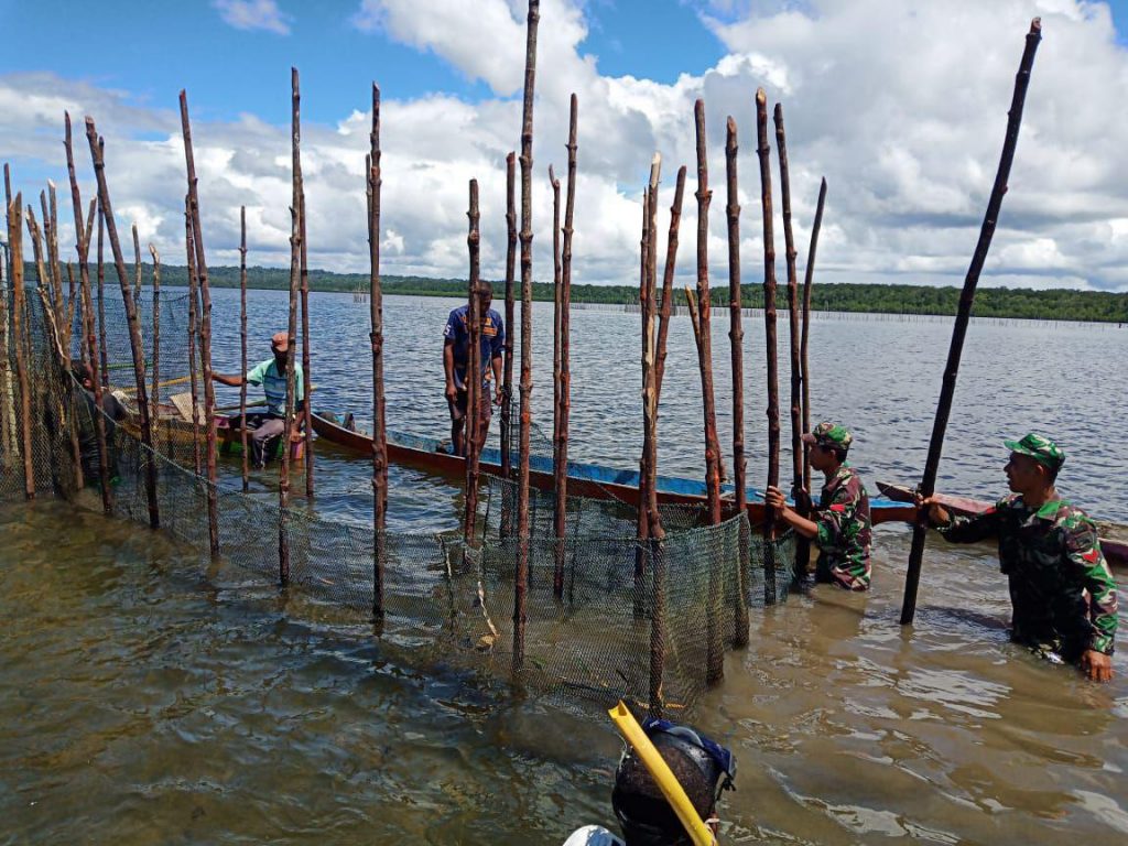 Raja Ampat –  Babinsa Koramil 03/ Samate Kodim 1805/Raja Ampat Serka Darwin, Koptu Bahmid dan Koptu Laode Taufan Didampingi Danramil 03/Samate Lettu Inf Musa Maknun membantu Masyarakat membuat Sero (alat tangkap ikan) di Kampung Waidim, Distrik Salawati Utara, Raja Ampat, Senin (20/05/2019).