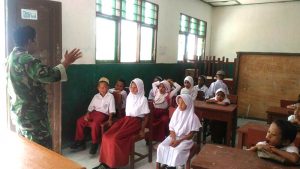 Fakfak – Babinsa Koramil 1706-01/Kota Serka Erpan Nusantoro bersama Babinsa Kopda Nur Said memberikan Wawasan Kebangsaan (Wasbang) tentang Bhineka Tunggal Ika, Pancasila kepada siswa siswi Sekolah Madrasah Ibtidaiyah Di Kampung Sembab Distrik Pariwari Kab. Fakfak, Senin (12/03/18).