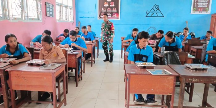 Upaya meningkatkan kesejahteraan gizi anak-anak sekolah, Personel Bintara Pembina Desa (Babinsa) jajaran Kodim 1801/Manokwari melaksanakan pendampingan dalam kegiatan pendistribusian Makan Bergizi Gratis (MBG) di beberapa sekolah di wilayah Kabupaten Manokwari, Provinsi Papua Barat, Jumat (21/02/2025).