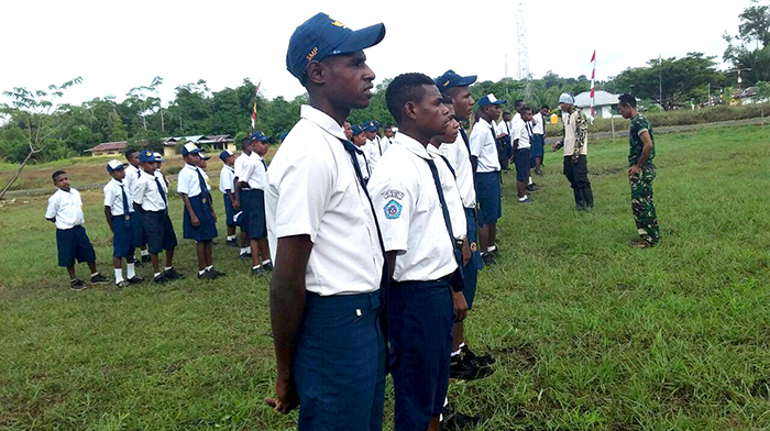 Kaimana – Bertempat di Distrik Kambrauw, Kab Kaimana, Babinsa Waho Serda Juanda beserta sertu Ronal wania mengajarkan Peraturan Baris Berbaris (PBB) kepada siswa dan siswi SMP N Kambrauw, guna membangun kedisiplinan dalam mengikuti proses belajar karena disiplin itu terbentuk dari sikap dan kepribadian diri sendiri salah satunya yaitu melalui PBB, Rabu(13/09/2017).
