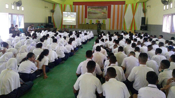 Kaimana – Bertempat di SMA N 1 Kaimana, Jl. Perindustrian Kaimana Serda Ari Susilo memberikan pembekalan Wawasan Kebangsaan dalam pelaksanaan MOS (Masa Orientasi Siswa) baru kelas X yang diikuti kurang lebih 200 Orang Siswa-siswi SMA N 1 Kaimana, Kamis (12/07/2018).