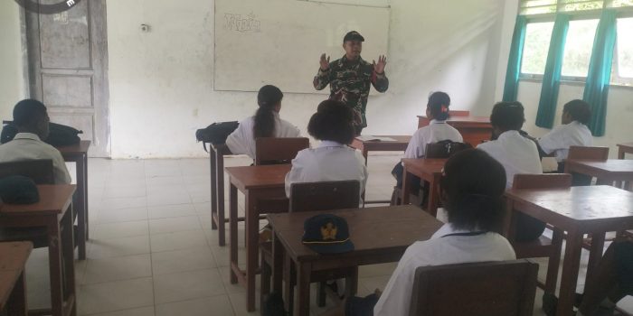 Babinsa Kodim 1804/Kaimana, Sertu Herman melaksanakan kegiatan Wawasan Kebangsaan dengan tema Menanamkan Nilai – Nilai Kebangsaan, di SMP Negeri 1 Sunua, Distrik Kambrau, Kabupaten Kaimana, Provinsi Papua Barat, Jumat (28/02/2025).