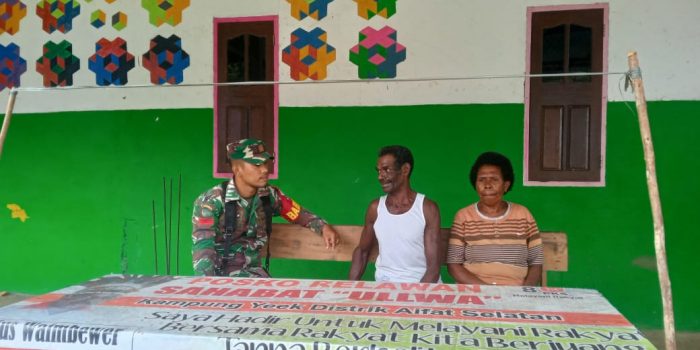 Pendim1809maybrat- Babinsa Satgaster Kodim 1709/Maybrat Praka Ambrosius Melaksanakan Komsos bersama Bapak Dominggus Brin tentang pencairan dana Kampung di Distrik Aitinyo, Kab. Maybrat, Papua Barat Daya. Selasa,(28/01/2025).