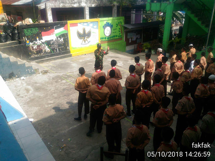 Fakfak – Babinsa Koramil 1706-01/Kota a.n Serka Erpan Nusantoro bersama Babinsa Kopda Nur Said memberikan Wawasan Kebangsaan (Wasbang) tentang Bhineka Tunggal Ika, Pancasila dan PBB kepada siswa siswi Sekolah SMP IT AS SALAM Kab. Fakfak, Jumat, (05/10/18).