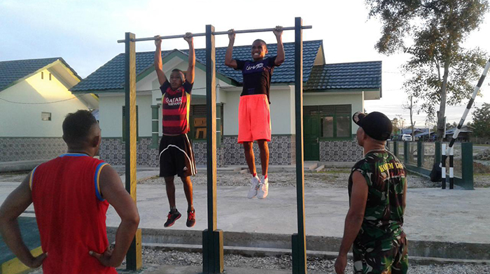 Fakfak – Bertempat halaman Makoramil 1706-05/Bombray, Distrik Bombray Kab. Fakfak Babinsa Koramil 1706-05/Bombray Serda Jusman Ali dan bersama Babinsa lainnya melaksanakan kegiatan pembinaan fisik kepada calon Prajurit TNI-AD, Rabu (29/08/2018).