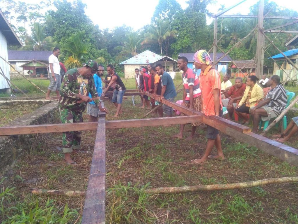 Pada kesempatan ini Babinsa Sumun bersama warga binaan, bahu membahu dan bergotong royong membantu mendirikan rangka rumah milik Bapak Albert Werfete.