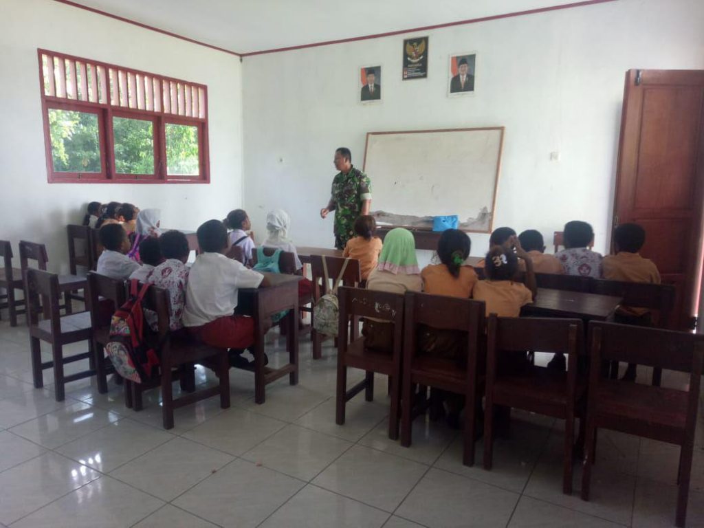 Kaimana – Bintara Pembina Desa (Babinsa) Koramil 1804-04/Buruway Kodim 1804/Kaimana, Sertu Sutarjo mengajar di Sekolah SD N1 Kampung Kambala Distrik Buruway Kabupaten Kaimana, Rabu (03/07/19).