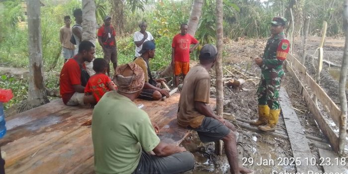 Bintuni, – Babinsa Koramil 1806/05 Tomu, Praka Arnol Ayer, membantu membersihkan lahan dan Komunikasi Sosial ( Komsos) bersama petani di Kampung Adur, Distrik Tomu, Kabupaten Teluk Bintuni, Papua Barat, pada Rabu (29/01/2025). Kegiatan ini berupa pembersihan lahan sawah pasang surut yang akan ditanami padi, sebagai bagian dari program ketahanan pangan di wilayah tersebut.