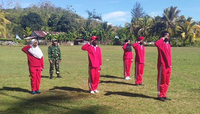 Fakfak – Babinsa Koramil 1706-04/Karas, Serda Samsul Arifin melatih persiapan pengibaran Bendera Merah Putih di Distrik Karas Kab. Fakfak, Kamis (16/08/2018).