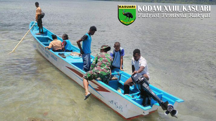 Melihat anak – anak tersebut, Serda Juned, Babinsa Kampung Baengkete Koramil 1704-10/Makbon berinisiatif membantu menyeberangkan anak – anak sekolah kembali kekampung setelah selesai melaksanakan kegiatan belajar menggunakan perahu motor.