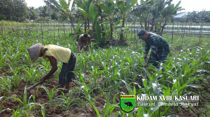 Sorong – Babinsa Koramil 1704-01/Sorong Timur melaksanakan pendampingan pertanian dalam pembersihan lingkungan sekitar persawahan dari rumput liar, bertempat di Kelurahan Malawele Aimas, Kabupaten Sorong, Senin (17/04/2017).