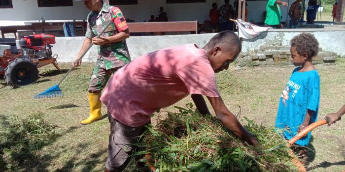 Tampak terlihat, antusias masyarakat melaksanakan kegiatan pembersihan halaman Gereja GKi Petrus Yoom I bersama Babinsa Koramil 1801-05/Manokwari Utara.