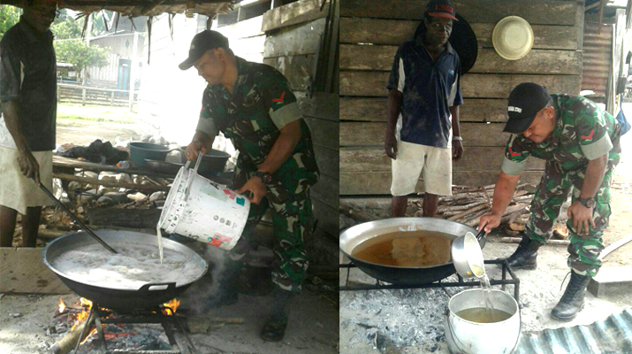 Manokwari – Perkiraan Keadaan Medan/Perkiraan Keadaan Taktis ( PKT/PKM ) adalah ilmu dasar seorang TNI-AD guna mencapai hasil yang memuaskan dengan resiko yang relatif kecil. Ilmu tersebut di aplikasikan Babinsa Koramil 1703-02/Saukorem Pelda Suharno selaku Danpos Ramil Saukorem dan Kopda Ibrahim selaku Babinsa Kampung Walpaperi dalam membantu masyarakat binaannya membuat minyak kelapa secara tradisional yang bertempat dirumah salah satu warga Kampung Walpaperi, Dist. Saukorem, Kab. Tambrauw Prov. Papua, Rabu (17/05/17).