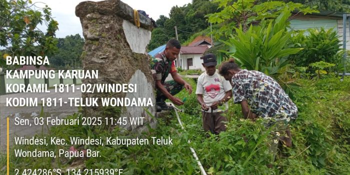 Pada hari senin, 3-febuari-2025,bertempat di Kp Windesi,Distrik Windesi babinsa ramil -02/wds, Srd ,Koromat melaksanakan giat ,kerja bhakti pemasangan pipa air bersih, bersama petugas air Kp.Windesi.
