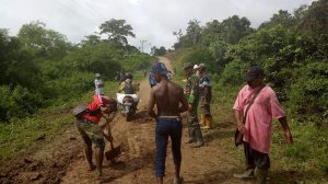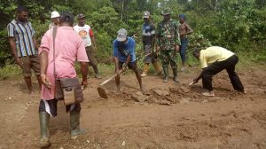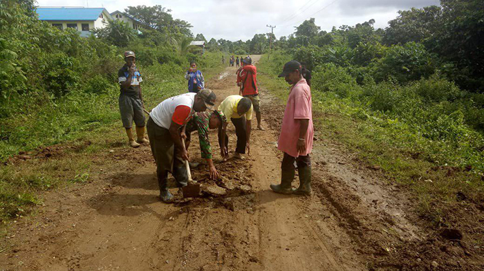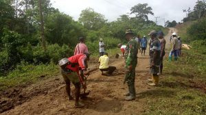 Sorong – Babinsa kelurahan Katinim Koramil 1704-03/Salawati, Kopda Wahidin bersama masyarakat melaksanakan karya bhakti memperbaiki jalan yang rusak berada di jln pemukiman kelurahan Katinim distrik Salawati kab.Sorong, Kamis (25/10/18).